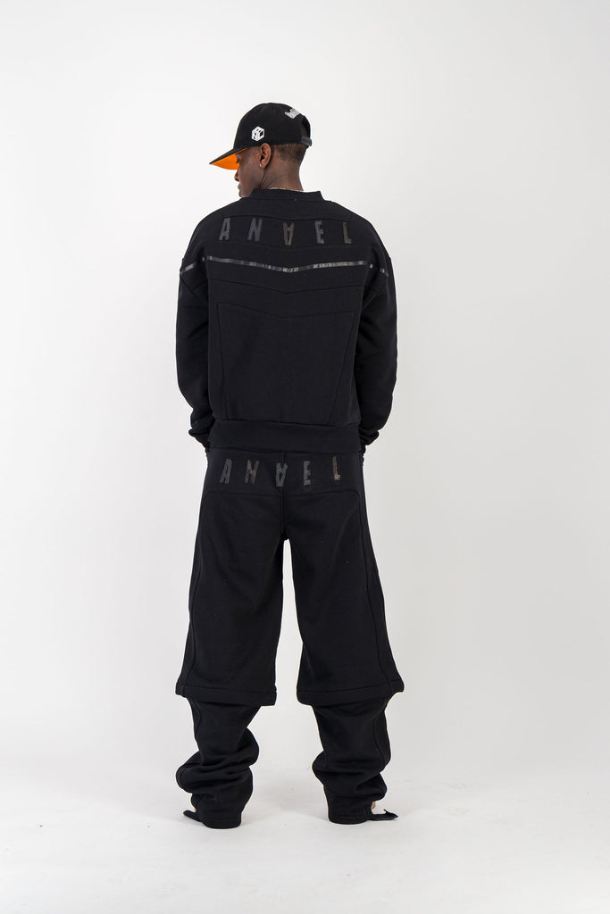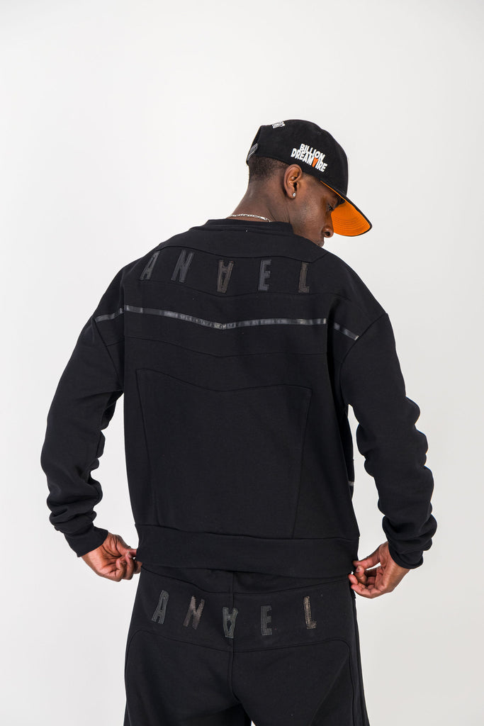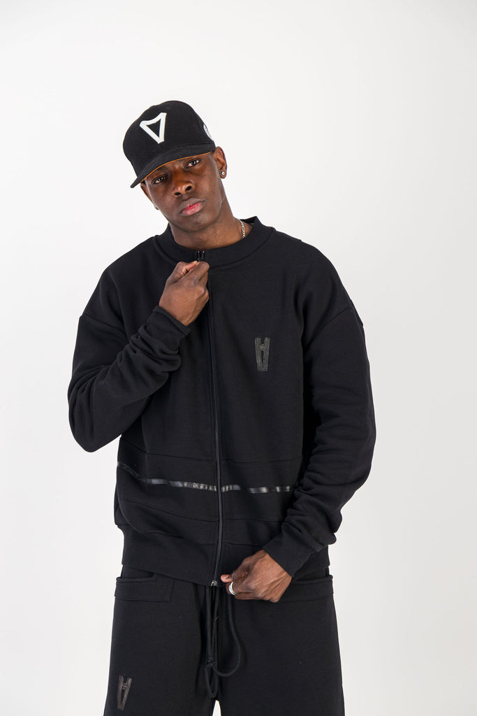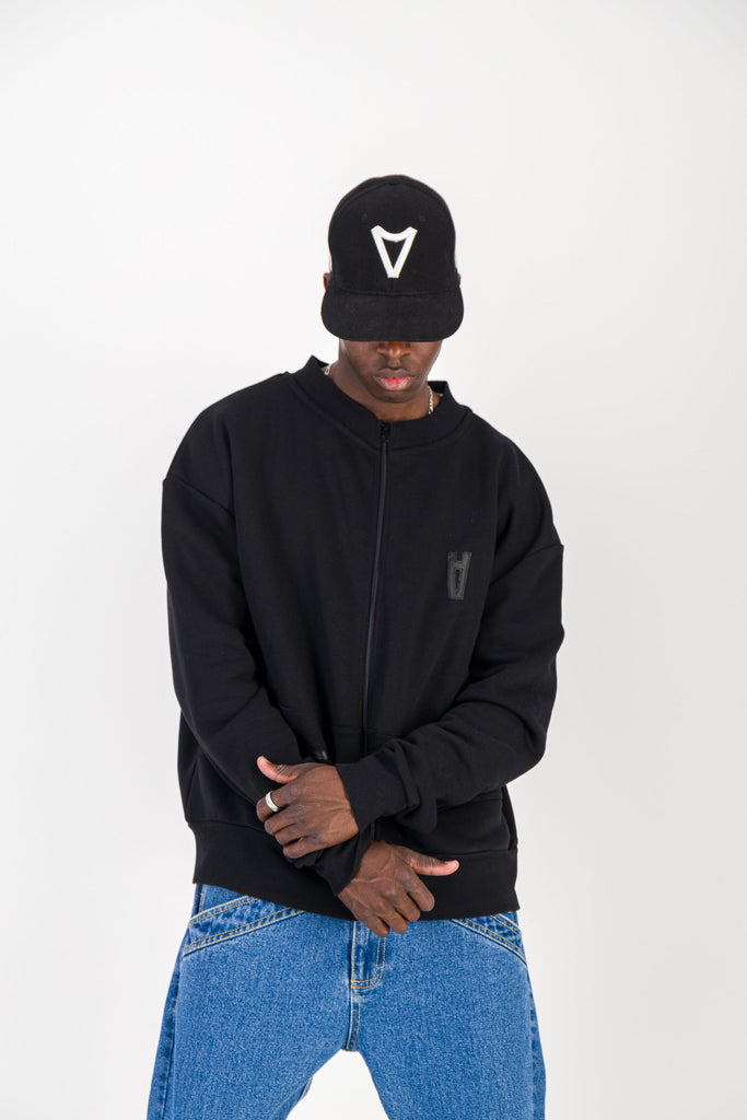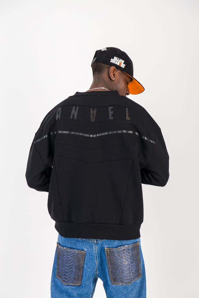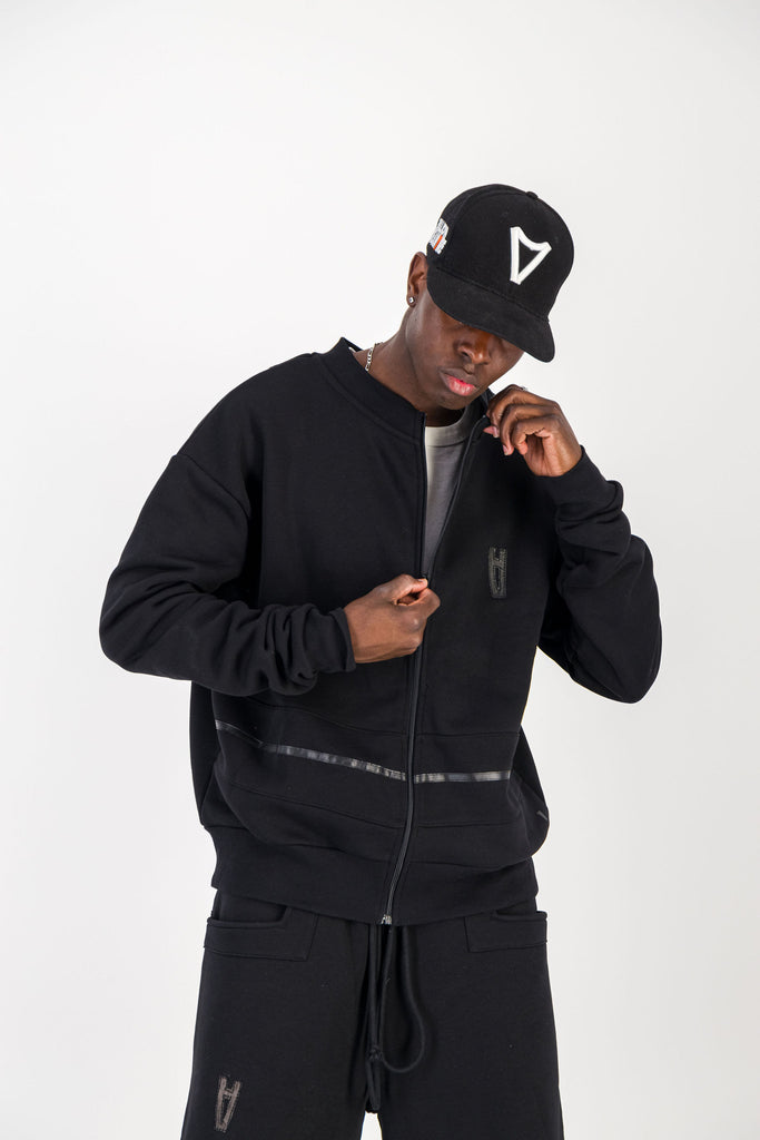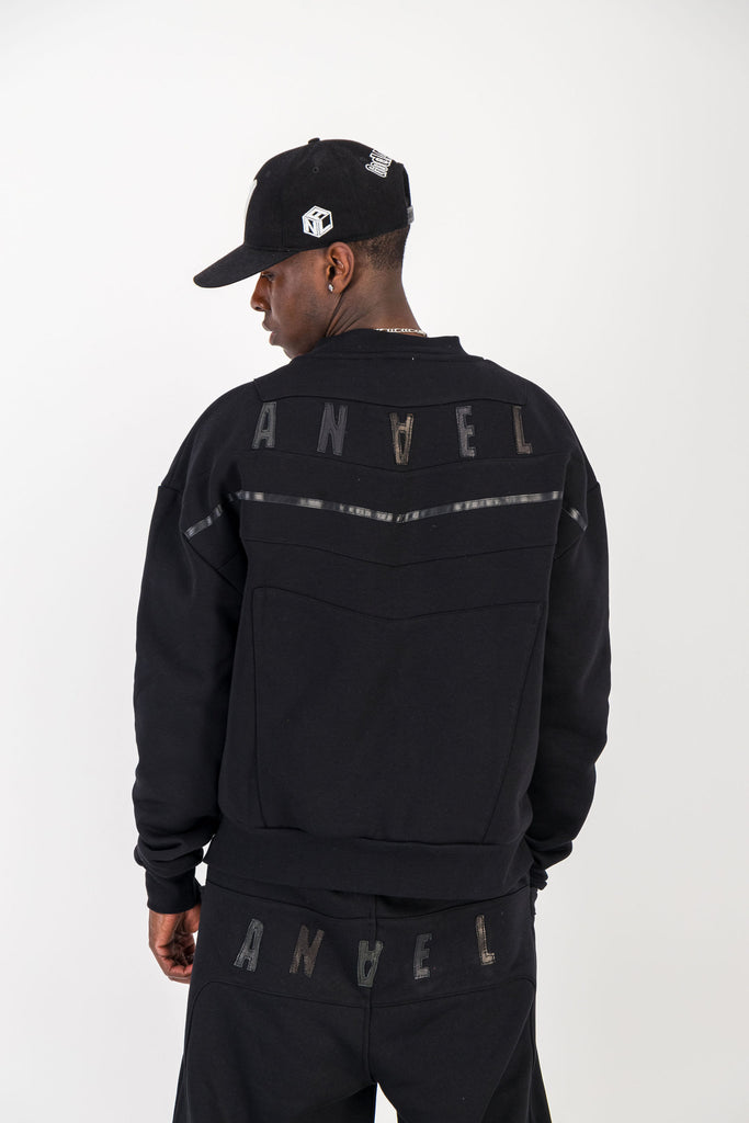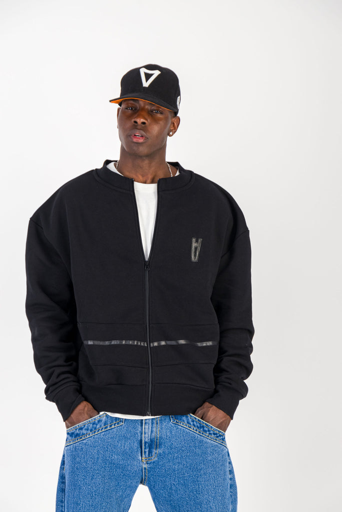 BLACK CREWNECK BOMBER JACKET W/ LEATHER LOGO