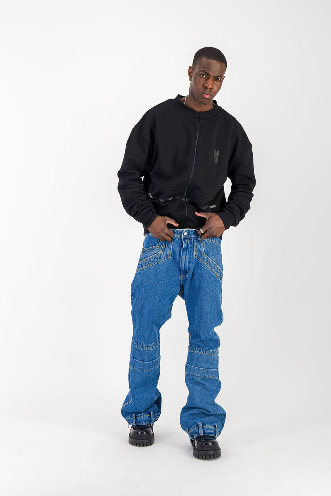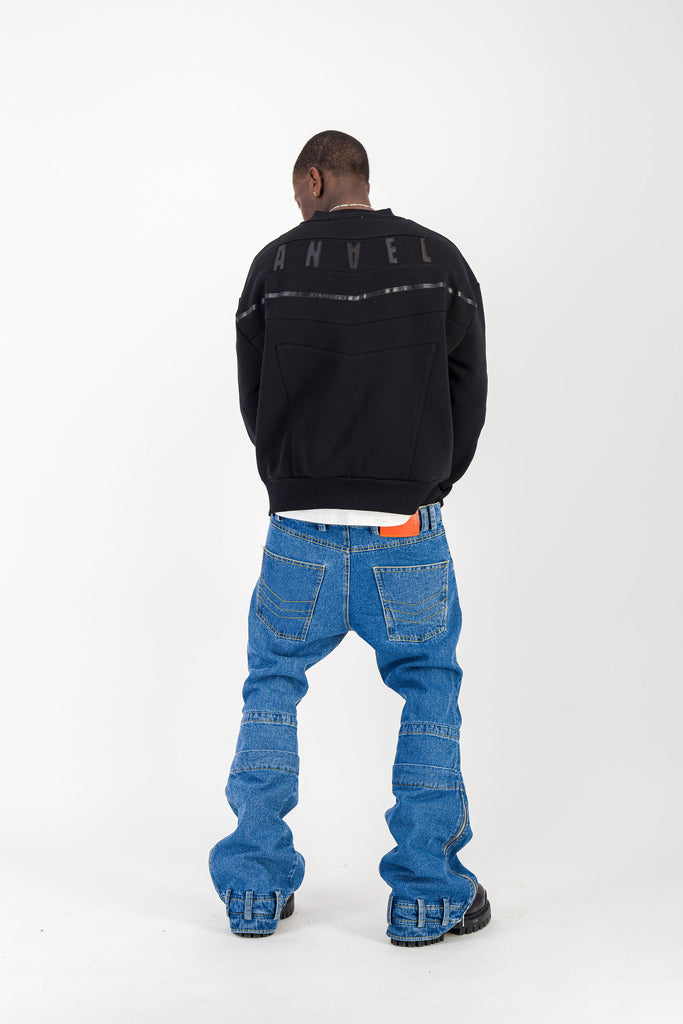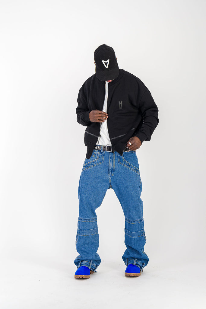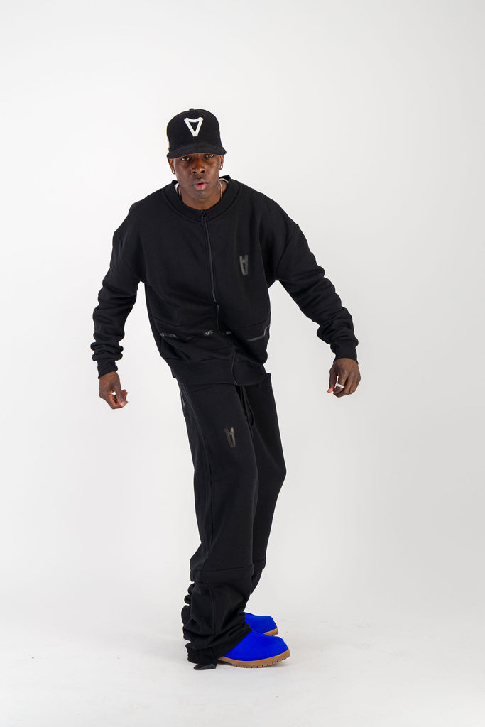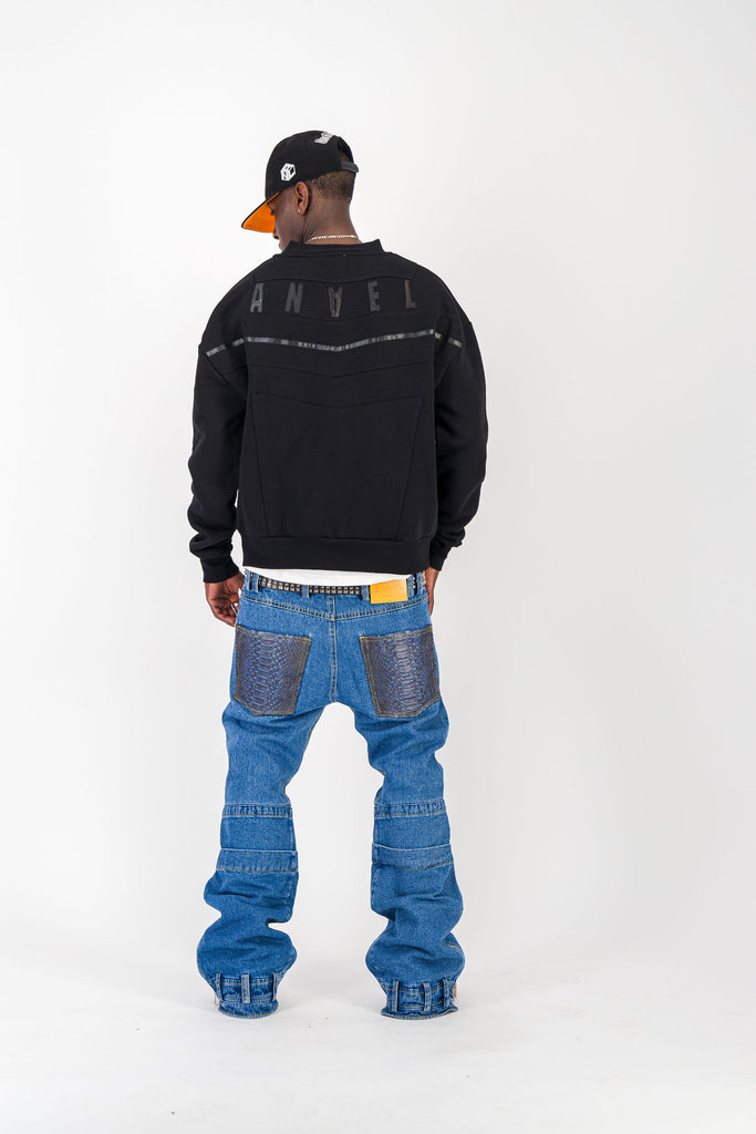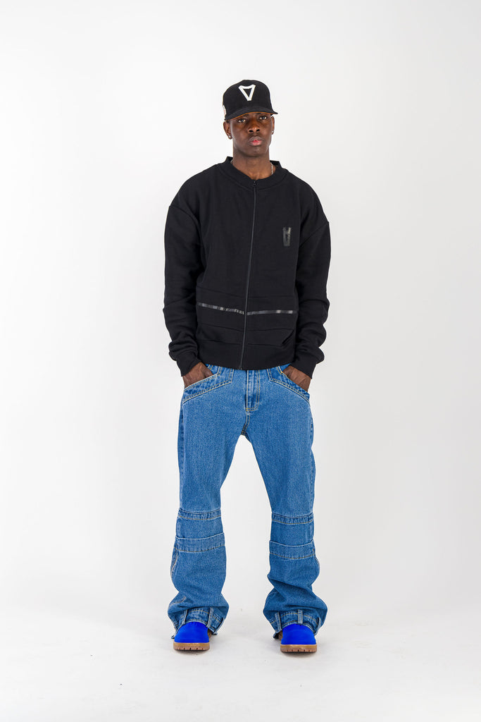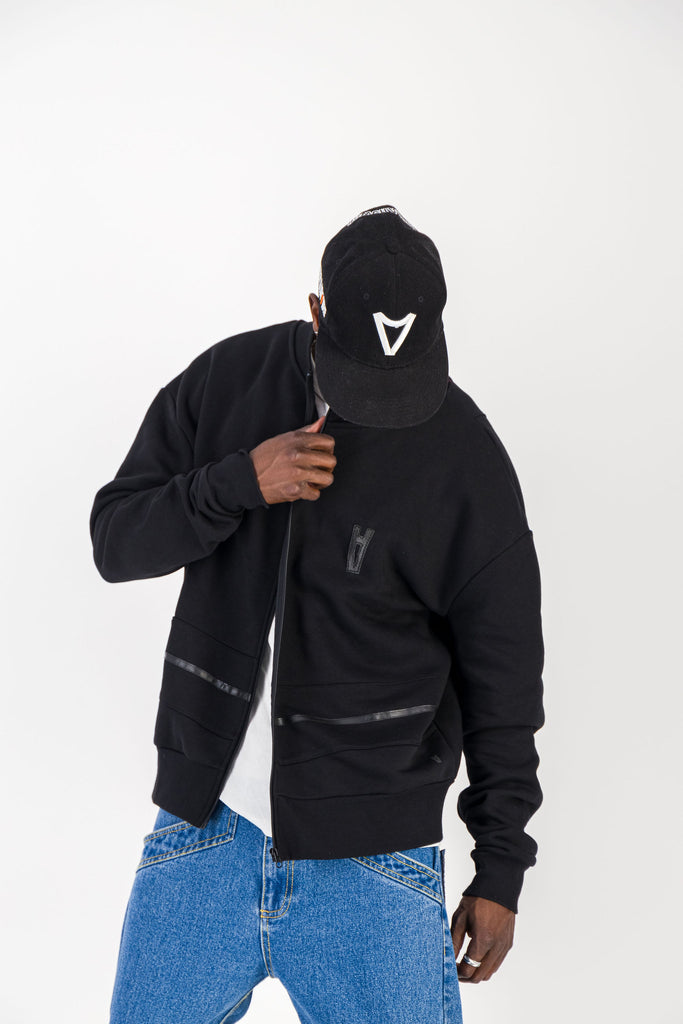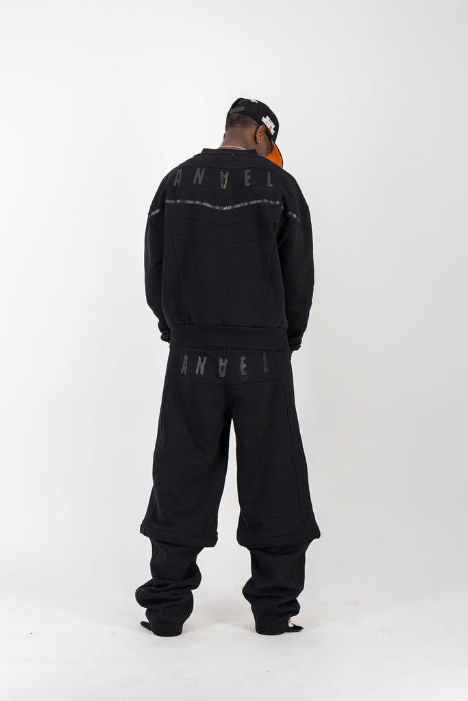 BLACK CREWNECK BOMBER JACKET W/ LEATHER LOGO